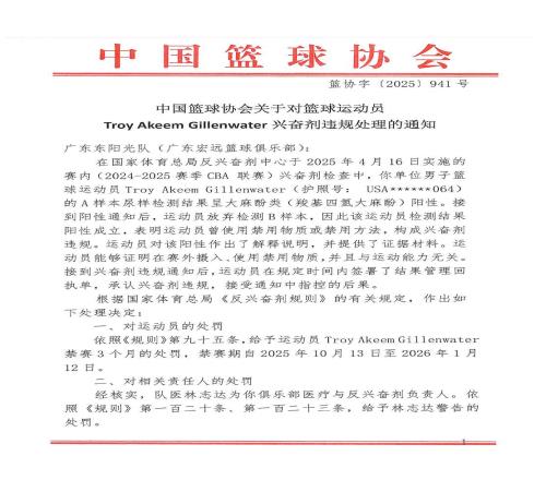 中國籃球協(xié)會13日宣布,對興奮劑違規(guī)的中國男子籃球職業(yè)聯(lián)賽(CBA)外援吉倫沃特處以禁賽3個月的處罰。 中國籃協(xié)...