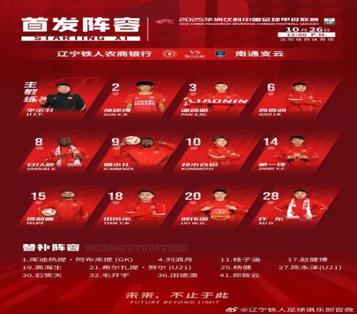 遼寧鐵人與南通支云的首發(fā)陣容揭曉姆本扎與邦本宜裕領(lǐng)銜陳彬彬?qū)⒙氏瘸鰣鯻中超直播