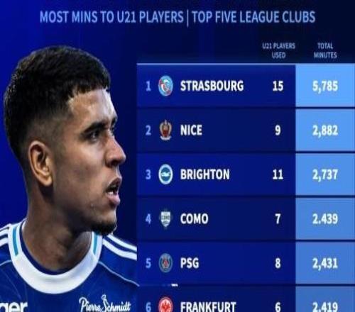 北京時間10月16日,德轉(zhuǎn)統(tǒng)計出了本賽季至今歐洲五大聯(lián)賽俱樂部U21球員的出場時間排行榜,斯特拉斯堡15名球員共...