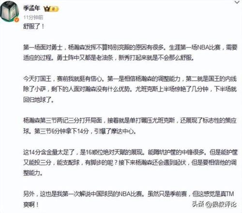 體壇周報(bào)記者孟季年表示:第一場(chǎng)面對(duì)勇士,楊瀚森發(fā)揮不算特別亮眼的原因有很多。生涯第一場(chǎng)NBA比賽,需要適應(yīng)的過程。勇士陣中又都是老油條,新秀打起來就是不會(huì)那么舒服。