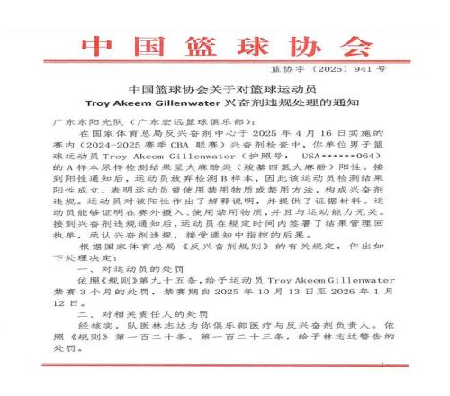 中國籃協(xié)在給廣東東陽光隊(廣東宏遠籃球俱樂部)下發(fā)的通知中說:“在國家體育總局反興奮劑中心于2025年4月16日實施的賽內(2024-2025賽季CBA)興奮劑檢查中,你單位男子籃球運動員Troy Akeem Gillenwater(吉倫沃特)的A樣本尿樣檢測結果呈大麻酚類(羧基四氫大麻酚)陽性。接到陽性通知后,運動員放棄檢測B樣本,因此該運動員檢測結果陽性成立,表明運動員曾使用禁用物質或禁用方法,構成興奮劑違規(guī)。運動員對該陽性作出了解釋說明,并提供了證據材料。運動員能夠證明在賽外攝入、使用禁用物質,并且與運動能力無關。接到興奮劑違規(guī)通知后,運動員在規(guī)定時間內簽署了結果管理回執(zhí)單,承認興奮劑違規(guī),接受通知中指控的后果?!?/p>