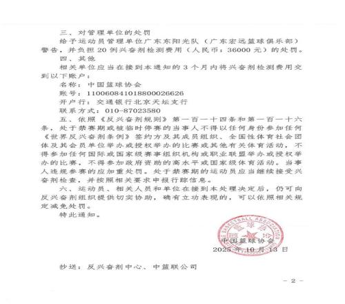 根據國家體育總局《反興奮劑規(guī)則》的有關規(guī)定,中國籃協(xié)對吉倫沃特做出了禁賽3個月的處罰,禁賽期自2025年10月13日至2026年1月12日。此外,廣東東陽光隊(廣東宏遠籃球俱樂部)作為管理單位受到了警告及負擔20例興奮劑檢測費用(人民幣36000元)的處罰,該單位的醫(yī)療與反興奮劑負責人、隊醫(yī)林志達被給予警告處罰。