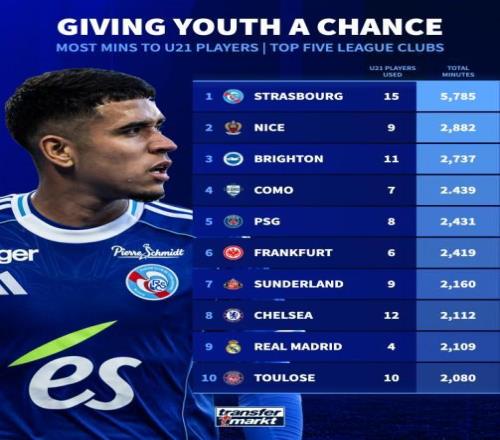 五大聯(lián)賽球隊本賽季U21球員出場時間:巴黎、切爾西、皇馬上榜 懂球帝 2025-10-16 19:01:00 北京時間10月16日,德轉統(tǒng)計出了本賽季至今歐洲五大聯(lián)賽俱樂部U21球員的出場時間排行榜,斯特拉斯堡15名球員共計出場5785分鐘高居第一,巴黎圣日耳曼、切爾西以及皇家馬德里也都進入前10位。五大聯(lián)賽俱樂部本賽季U21球員出場時間排行榜:1. 斯特拉斯堡 15人 5785分鐘2. 尼斯 9人 2882分鐘3. 布萊頓 11人 2737分鐘4. 科莫 7人 2439分鐘5. 巴黎圣日耳曼 8人 2431分鐘6. 法蘭克福 6人 2419分鐘7. 桑德蘭 9人 2160分鐘8. 切爾西 11人 2112分鐘9. 皇家馬德里 4人 2109分鐘10. 圖盧茲 10人 2080分鐘【上咪咕獨家看英超】英超免費觀看_皇馬免費觀看_大聯(lián)賽免費觀看_英超高清在線_皇馬高清在線_大聯(lián)賽高清在線 英超 皇馬 大聯(lián)賽 切爾西隊 桑德蘭隊 皇家馬德里 巴黎圣日耳曼 上一篇: TA:現(xiàn)在英超重視定位球,運動戰(zhàn)進球減少,曼城式傳控被拋棄 下一篇: 拜仁CEO:外界夸大了英超球隊優(yōu)勢,我們仍具備頂級吸引力