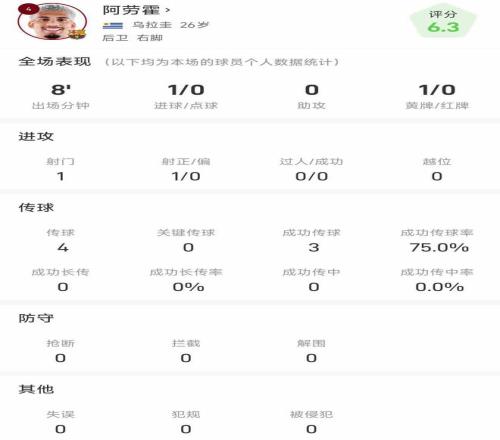 阿勞霍數(shù)據(jù):替補(bǔ)上場扮演中鋒,8分鐘1次射門制造絕殺 雷速體育 2025-10-19 07:01:15 雷速體育10月19報(bào)道 本輪西甲,巴薩2-1擊敗了赫羅納。值得一提的是,本場比賽阿勞霍坐替補(bǔ)席上,第82分鐘才替補(bǔ)登場,而且上場后踢的是9號(hào)的位置,并且取得了重要的進(jìn)球。統(tǒng)計(jì)顯示,阿勞霍本場比賽上場8分鐘,1次射門,打入1球。他有4次傳球,其中3次成功傳球準(zhǔn)確率為75%。因?yàn)樯蠄鰰r(shí)間短,阿勞霍的統(tǒng)計(jì)數(shù)據(jù)并不多。 赫羅納免費(fèi)觀看_巴塞羅那隊(duì)免費(fèi)觀看_歐洲杯揭幕戰(zhàn)免費(fèi)觀看_赫羅納高清在線_巴塞羅那隊(duì)高清在線_歐洲杯揭幕戰(zhàn)高清在線 赫羅納 巴塞羅那隊(duì) 歐洲杯揭幕戰(zhàn) 羅納德·阿勞霍 上一篇: 保利尼奧:離開巴薩回廣州是因他們很有誠意,當(dāng)時(shí)算是三方都贏 下一篇: 小西蒙尼:攻破那不勒斯的球門并不容易,那是一種情感的交織