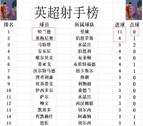 射手榜方面,哈蘭德進(jìn)球勢頭不減,今天又是梅開二度,成為賽季首個進(jìn)球上雙的球員,8輪11球穩(wěn)居榜首。塞梅尼奧6球,比哈蘭德少了近一半,排在第2。馬特塔5球第4,維爾貝克,安東尼,蒂亞戈和沃爾特馬德4球并列第4。哲凱賴什今天無力進(jìn)球,還是和埃基蒂克,恩佐等人3球剛好擠入前十。