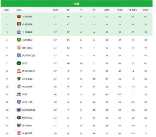 在第27輪結(jié)束2個比賽日之后,中超積分榜可以說是一夜變天,海港、蓉城和申花三強(qiáng)爭冠進(jìn)入白熱化,北京國安大崩盤徹底掉隊(duì);