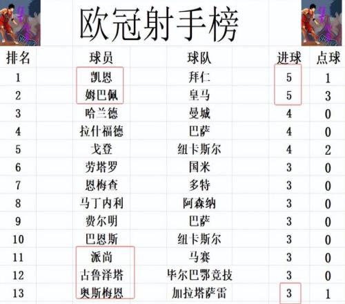 射手榜方面,姆巴佩今天錯失良機沒有進(jìn)球,被打入1球的凱恩追上,兩人5球并列榜首。哈蘭德,拉什福德和戈登4球并列第3。古魯澤塔,奧斯梅恩,派尚破門,追上勞塔羅,費爾明等人3球剛好擠入前十。
