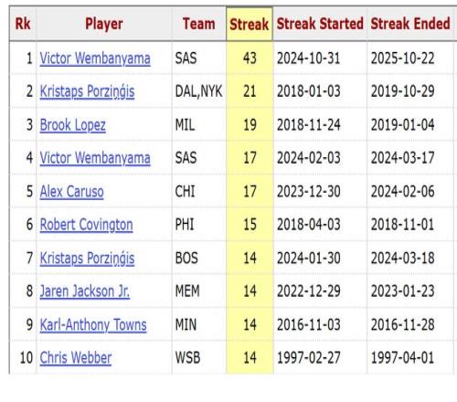 此戰(zhàn)之前,文班亞馬創(chuàng)造了連續(xù)43場比賽至少1三分+1蓋帽的壯舉,創(chuàng)造了獨一檔的NBA紀錄,排名歷史第二的是波津的連續(xù)21場。今日對陣鵜鶘,文班雖然有9個蓋帽,但三分球3中0,他的這個NBA紀錄就此中斷,止步于連續(xù)43場。