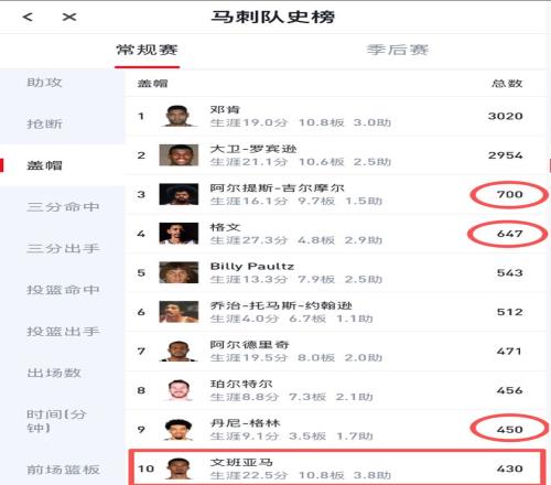 憑借新賽季前2戰(zhàn)的12記蓋帽,文班亞馬NBA生涯的總蓋帽數(shù)達(dá)到了430個(gè),成功躋身馬刺隊(duì)史蓋帽榜前十,距離第9丹尼-格林的450個(gè)只差20個(gè)。