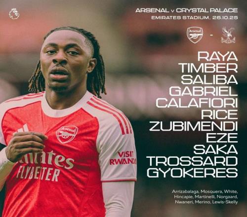 阿森納首發(fā):1-拉亞、12-廷貝爾、2-薩利巴、6-加布里埃爾、33-卡拉菲奧里、41-賴斯、36-蘇比門迪、10-埃澤、7-薩卡、19-特羅薩德、14-哲凱賴什