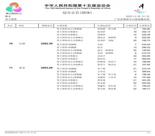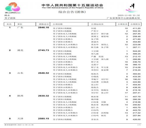 由陳艾森、謝思埸兩位奧運冠軍領(lǐng)銜的廣東跳水男隊以2846.16分的總成績于11月3日晚成功衛(wèi)冕全運會跳水男子團體金牌。由王宗源領(lǐng)軍的湖北隊以2745.43分位居第二。上屆全運會該項目亞軍山東隊以2646.52分的成績再次成功登上領(lǐng)獎臺。