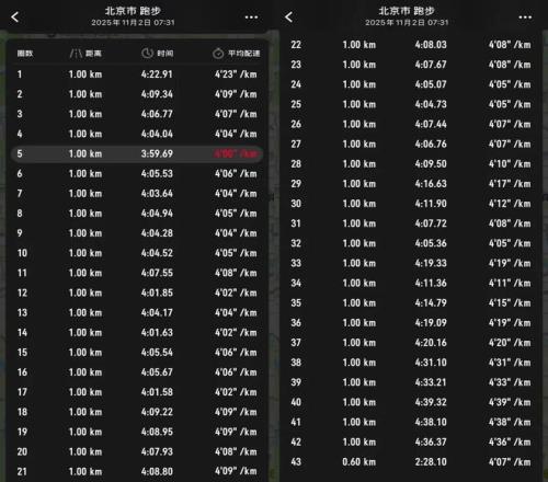 跟他跑了500米后,我自己真不行了,當(dāng)時配速掉到419-420。37公里后,北馬最大的一個爬升出現(xiàn)了。在奧林東橋上橋時,我徹底廢了——如果沒這段爬升,也許最多掉到430左右 ,最后以2575幾完賽,但我徹底崩在了這里。崩完后,我用438-439順了兩公里。