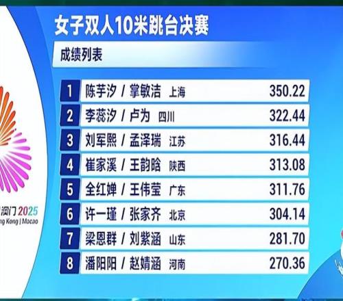 11月6日,2025粵港澳全運會進行了雙人女子10米臺跳水決賽,陳芋汐和掌敏潔聯(lián)手,奉獻了高質(zhì)量的五跳,以350.22分的高分奪冠。全紅嬋和王偉瑩組合311.76分獲得第五,張家齊與許一瑾組合以304.14分獲得第六。