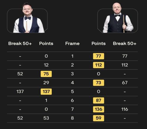 希金斯對陣墨菲的比賽中,希金斯打出兩桿單桿破百(112、116)和兩桿50+(77、67),墨菲打出一桿137分和兩桿52分,上半場希金斯取得3-1的領(lǐng)先,休息歸來后墨菲轟出137分扳回一城,隨后希金斯連勝兩局拿到賽點,第八局兩人面對最后一顆紅球展開爭奪,希金斯準進上演逆轉(zhuǎn),最終6-2獲勝。