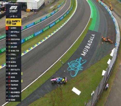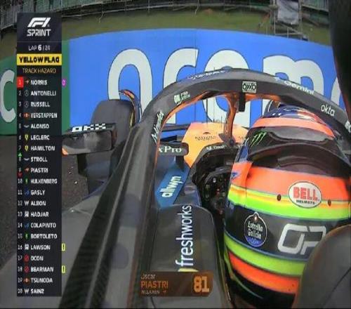 沖刺賽五盞紅燈熄滅,大家起步都沒有問題,維斯塔潘超越阿隆索上到第五位。比賽進(jìn)行到第6圈,皮亞斯特里上墻!克拉平托與霍肯伯格也卷入事故,賽會干事先是啟動安全車,隨后還是出示紅旗!小皮和克拉平托退賽,回放顯示皮亞斯特里、霍肯伯格和克拉平托都是在壓到3號彎的潮濕路肩后失控撞墻。