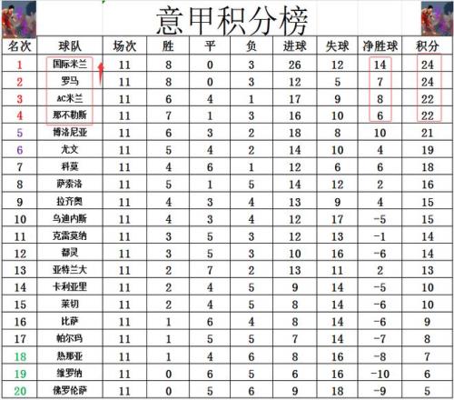 積分榜方面,國米和羅馬今天都贏了球,這樣的話他們就都超過了輸球的那不勒斯和本輪打平的AC米蘭,國米憑借著凈勝球優(yōu)勢力壓羅馬登頂,羅馬屈居第2。那不勒斯完敗后,不僅被國米,羅馬超過,還因凈勝球劣勢,被AC米蘭躺著超過,跌到第4。